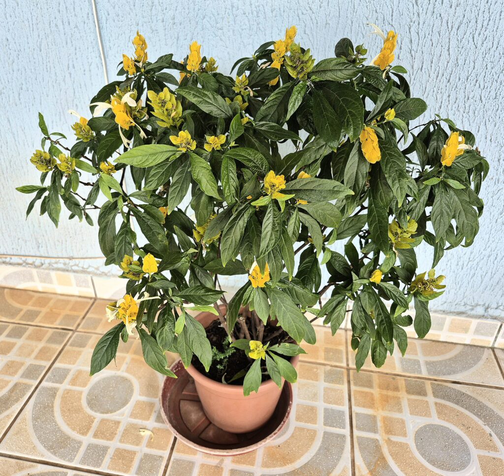 Pachystachys lutea Nees é o nome específico do camarão-de-jardim. Um arbusto que pode chegar de 1 a 2 metros de altura, mas normalmente fica entre 1 m, 1,5m.