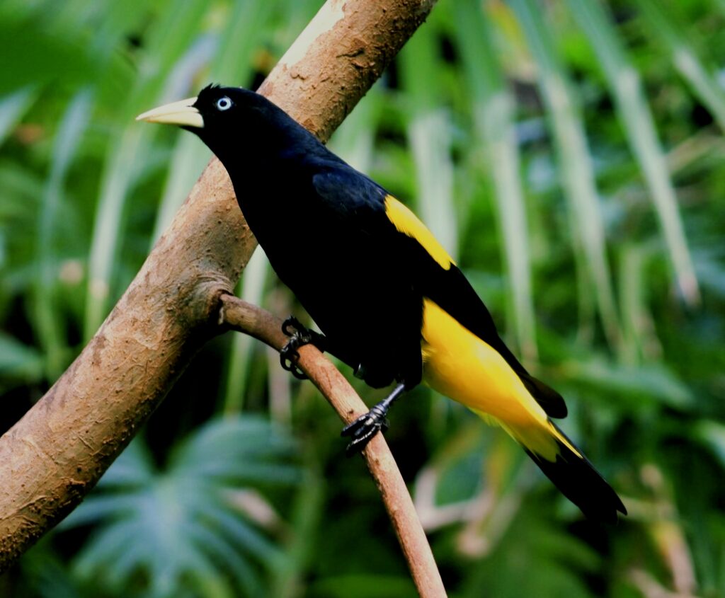 O japiim-xexéu (Cacicus cela) é encontrada amplamente na Amazônia e em outras regiões tropicais da América do Sul. É reconhecida por seu contraste de plumagem preta com amarelo-vivo, olhos azuis e pelo canto variado e melodioso, frequentemente emitido em bandos próximos a rios e florestas úmidas.